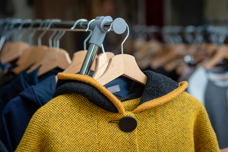 Coats and jackets on hangers in the store. Sale of outerwear.