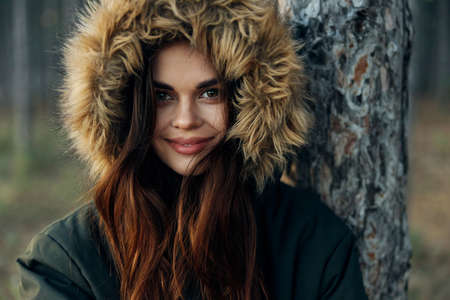 Stylish woman 20-24 year old with long hair wearing pink winter coat leaning on tree in park close up. Lokking at camera. 20s.