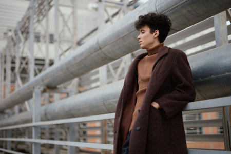 Fashionable young man in a brown coat and sweater, standing in front of a large industrial building, looking into the distance