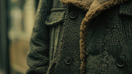 Knitted fabric structure. Gray jacket with black buttons close-up. Front and inner side