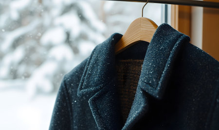close-up of a hand with a branch of rowan in the pocket of a warm autumn coat.