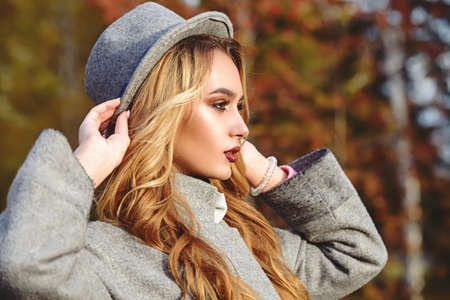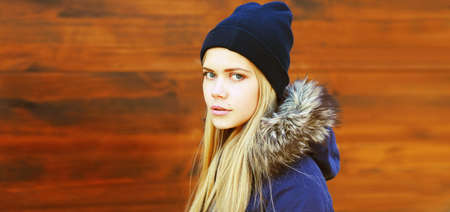 Portrait of beautiful blonde young woman wearing hat and jacket in the city