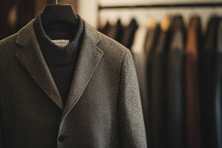 Boutique clothing rack featuring a variety of fashionable and stylish outerwear in warm tones. concept of fashion retail, style selection, clothing display.