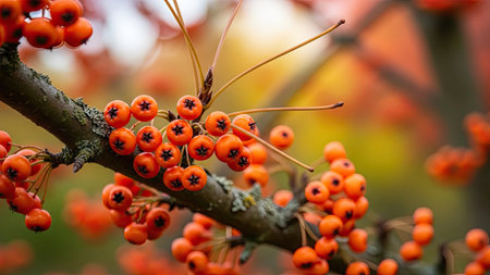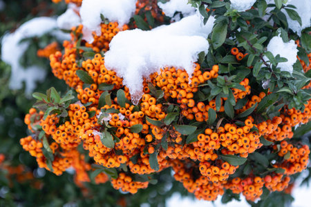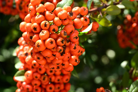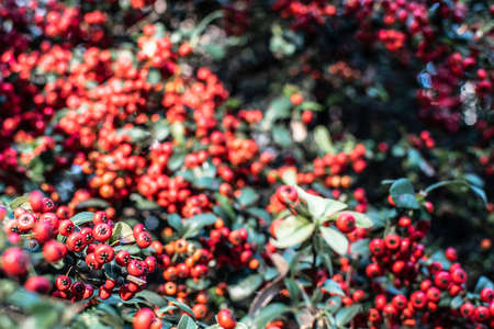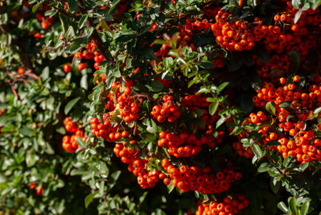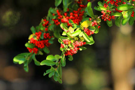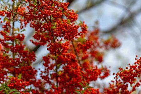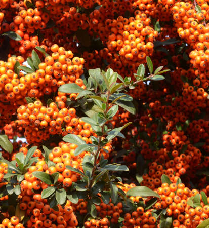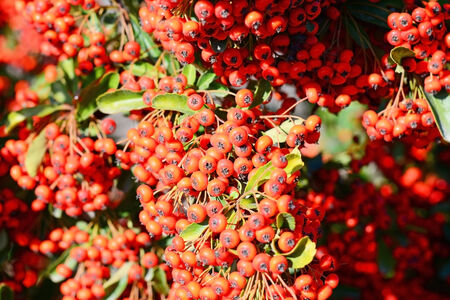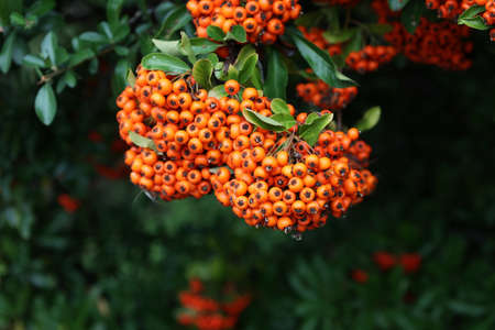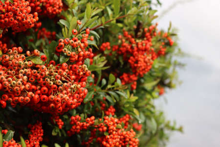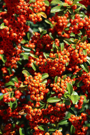 Rowanberries sour but rich vitamin C. Pyracantha plant, also known as firethorn in a garden in a sunny autumn day, beautiful outdoor floral background photographed with soft focus