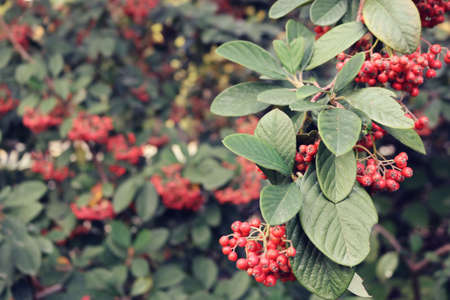 Bush with lots of red berries on branches, autumnal background. Close-up colorful autumn wild bushes with red berries and cold green leaves in the park. Shallow depth of field
