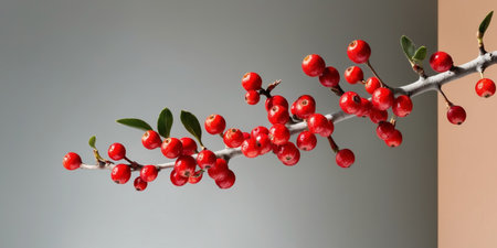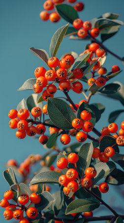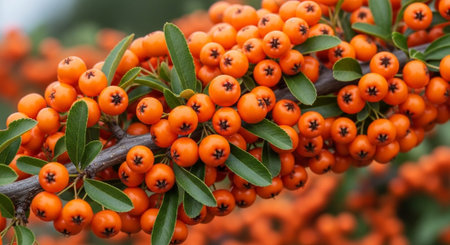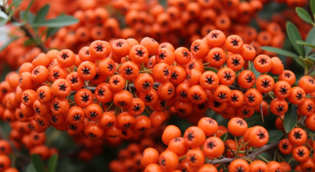 Generative AI : Red autumn berries of Pyracantha with green leaves natural seasonal fall background