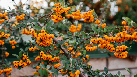 Small yellow and orange fruits or berries of Pyracantha plant, also known as firethorn in a garden in a sunny autumn day, beautiful outdoor floral background photographed with soft focus