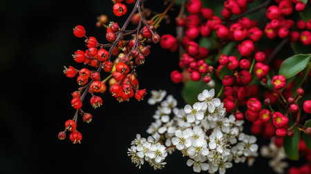 Close-up view of vibrant red berries nestled among lush green leaves, showcasing nature's beauty with rich colors and a serene atmosphere perfect for seasonal themes.