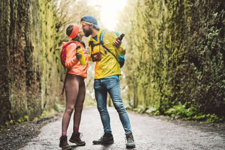 Happy couple kissing while exploring touristic park - Young tourist having fun doing excursion in wild forest - Tourism travel people love relationship and vacation lifestyle concept