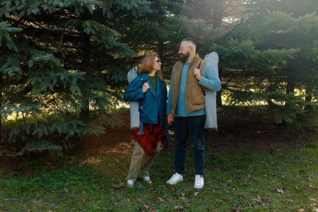 Traveler couple in love enjoying in the forest. Freedom and active lifestyle concept. Back view