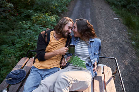 Attractive happy couple is relaxing in the green sunny forest while sitting on the log.