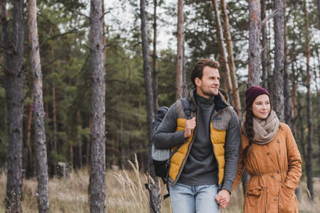 couple with backpacks holding hiking sticks and looking away in forest, banner