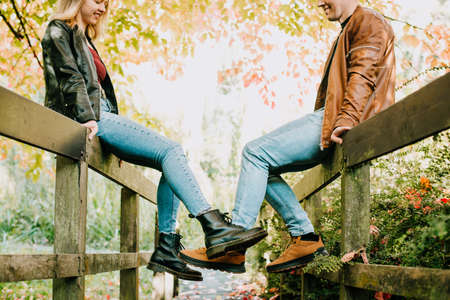 Young couple in love having fun and enjoying a walk in the autumn park. Focus on legs in boots. Selective focus, copy space.