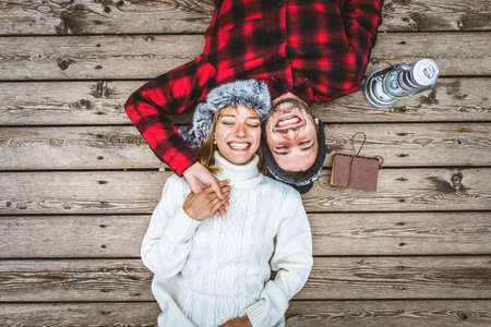 Beautiful young teen couple spending time together outside in cold winter. Happy and joyful people