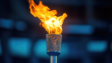 Flame burns in Olympic torch against blurred sports arena