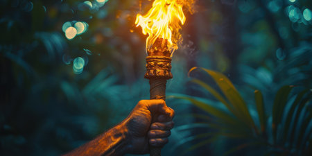 A hand holds a brightly burning torch, illuminating the dark surroundings, symbolizing adventure, light in darkness, and the spirit of exploration. Perfect for highlighting courage or tradition.
