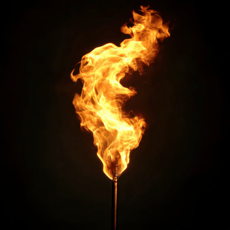 A bright flame flickers and twists from a torch illuminating the surrounding darkness. The warm glow contrasts against the shadows creating a captivating atmosphere.
