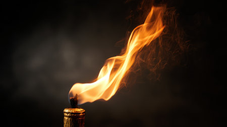 Torch flame, smoke, dark background.