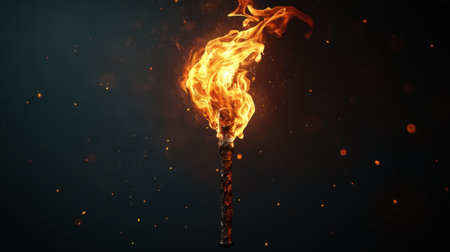Flames flicker and swirl dramatically from the top of a torch, illuminating the dark surroundings with bright, warm light. The dynamic movement of fire captures the viewer's attention.