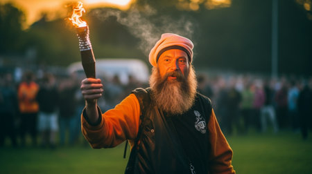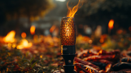 A vibrant flame dances atop a traditional torch illuminating its textured surface. The dark background enhances the warmth of the fire creating a captivating scene during a festive occasion.