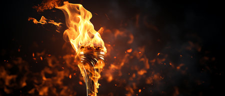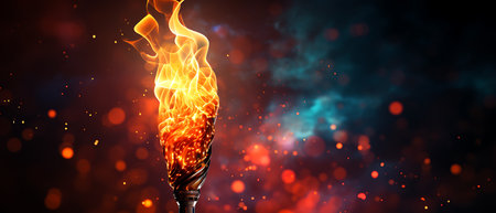 Torch with flame on blurred dark background with lights and sparkles. Olympic Games Fire