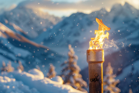 Hand in white glove holding olympic torch with bright flame against snow-capped mountain peaks and cold winter sky, symbolizing hope, achievement and the spirit of the games