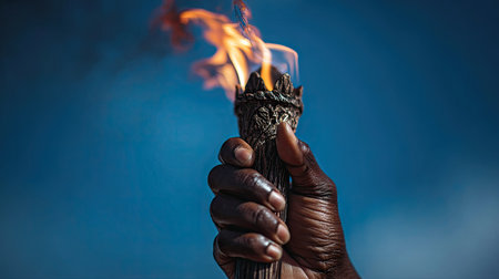 A dark-skinned hand firmly grasps a burning torch, its flames dancing against a vibrant blue backdrop. The image showcases the texture of the hand and the flickering light of the flame. The composition suggests themes of illumination, guidance, and the conveying of information, suitable for various editorial and promotional purposes.