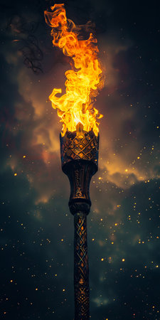 A blazing torch with a captivating flame dances vividly against a pitch-black background. Intricately engraved handle catches the eye, symbolizing light's triumph over darkness.