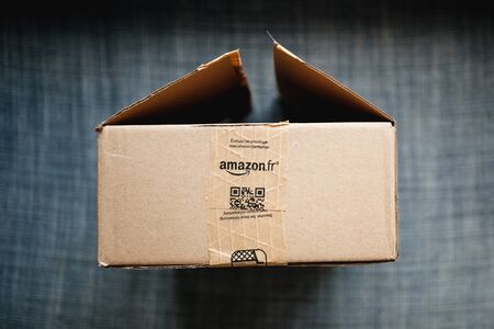 Paris, France - Jan 29, 2019: View from above at the open Amazon Prime cardboard box with Amazon.fr sticker