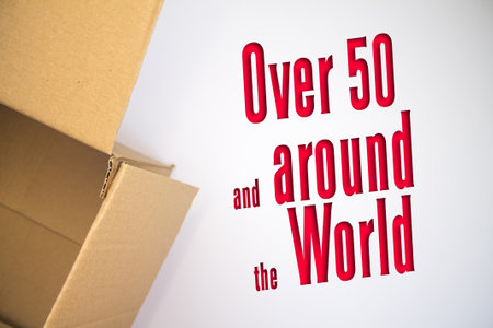 Over 50 and around the world word with cardboard box. Brown folded card box.