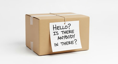 creative image of cardboard box with taped handwritten note reading hello is there anybody in there, humorous and conceptual communication theme. ai generated.