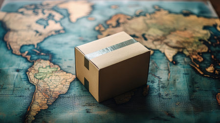 A parcel box placed on a world map, representing the growth of international business and global commerce