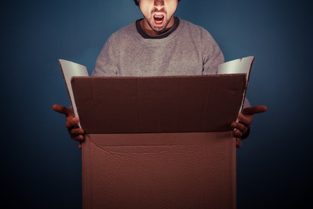 Surprised young man is opening a large cardboard box with something exciting inside it