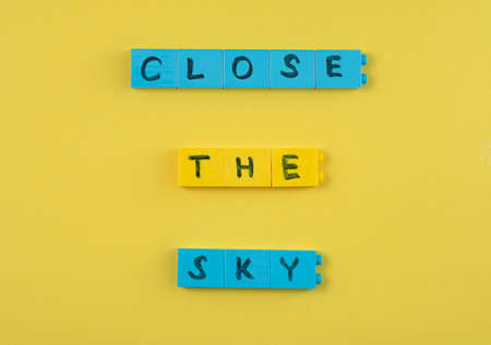 An inscription with a request to close the sky over Ukraine on a yellow background. The concept of a request to close the sky