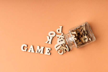 word game from wooden letters collected on orange background. glass container and wooden letters