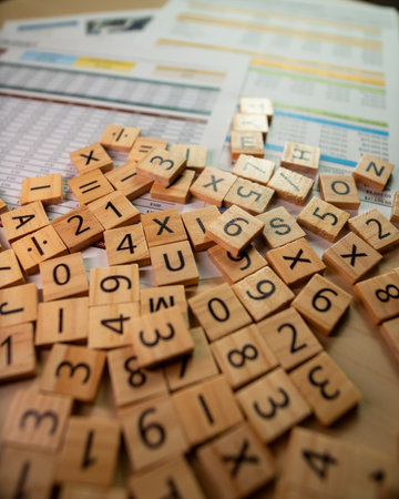 Letter tiles spread out on a table making crossword puzzle