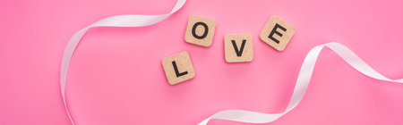 top view of love lettering on wooden cubes isolated on pink, panoramic shot