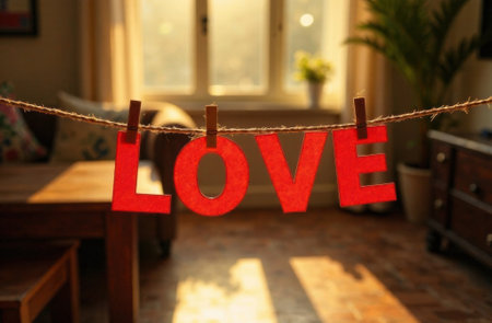 Soft red and grey letters spelling love stand against a blurred background of lights, creating a warm atmosphere perfect for romantic themes and celebrations.