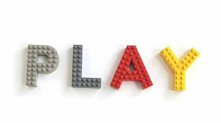 A set of building blocks spelling out Play, with space for text on the surrounding white background.