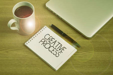 Writing displaying text Creative Process. Business concept act of making new connections between old ideas Unique Closed Laptop Beside Empty Journal With Pen And Coffee Mug Over Table.