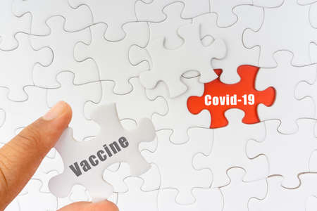 Hand holding jigsaw puzzle with text VACCINE and COVID-19. Covid-19 and Coronavirus concept