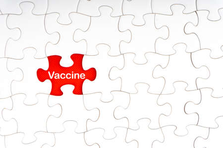 VACCINE text with jigsaw puzzle on red background. Covid-19 and Coronavirus Concept