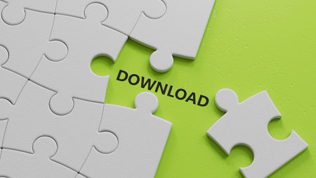 The white puzzle pieces with missing pieces spelling.Flat lay view from above on The white puzzle pieces with missing pieces buttons.IT technology concept.3D rendering on green background.