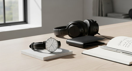 a bright desk scene with a watch headphones wallet notebook and pen ready for a productive day ahead