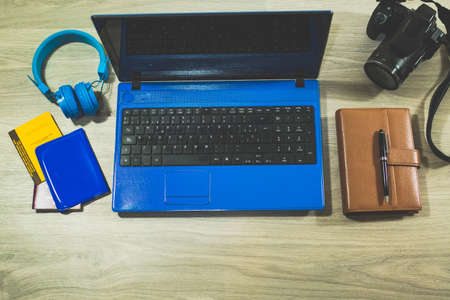 top view office desk. laptop and blue headphones, notepad, photo reflex camera, passports and vaccination letter to travel on wooden table. concept work and travel preparation