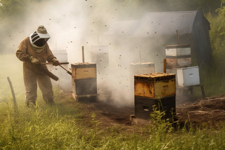beekeepers smoker in action, releasing smoke near beehives, created with generative ai