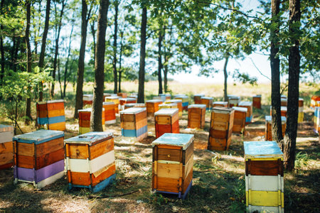 Colorful wooden beehives on forest apiary.