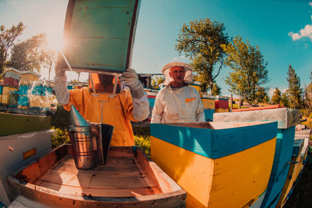 Apiarist, beekeeper is opening hive to control situation in bee colony before extract honey from bee hives, harvest.