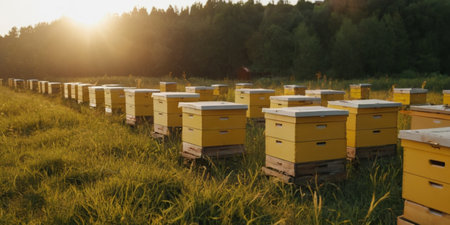 beekeeping apiary with rows of beehives surrounded by pollinator gardens, created with generative ai