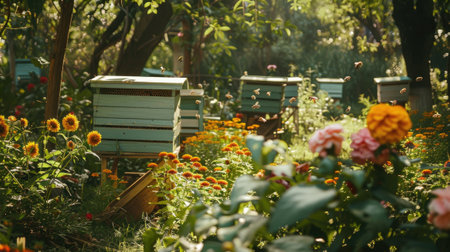 An apiary nestled in a lush garden, beehives arranged neatly among colorful flowers